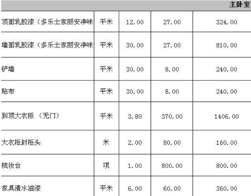 三、刷墙:目前,家装工程中刷墙的工艺主要为一遍界面剂,刮3遍腻子,刷3遍*胶漆。一些家装公司在报价时都将工艺和主辅材(腻子、界面剂、*胶漆)包含在内而不另行收费。不过也有一些公司将刷漆部分分开收费,由业主自己自行提供*胶漆。价格参考:刮腻子20~30元/平米,刷*胶漆15~40元/平米(包含腻子、界面剂、*胶漆在内)。产品参考:普通装修:使用*胶漆5L装,200元左右即可,立邦、多乐士、都芳、卡丹漆等都有相对应价格产品系列。中高档装修:可以选用一些含有除甲醛、净味等功效的高端漆,价格在300元~400元之间。刷墙面积计算:房屋面积×