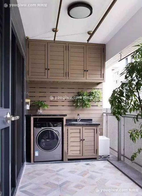 阳台空间也比较大,除了可以放洗衣机,上面的空间还能用来做洗衣柜、洗衣池,做个小型的洗衣房。